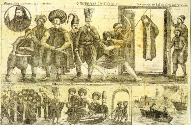 Στόχος τους δεν ήταν άλλος από τον Εθνομάρτυρα Πατριάρχη Γρηγόριο Ε΄ που παρά τις πιέσεις να εγκαταλείψει την Κωνσταντινούπολη και να φυγαδευτεί, προτίμησε να αντιμετωπίσει κατά πρόσωπο την μοίρα του. Τον κρέμασαν στην κεντρική πύλη για να τον ατιμάσουν και να παραδειγματίσουν. Άφησαν το άψυχο κορμί του να κρέμεται εκεί για τρία μερόνυχτα. Με κόπους η σωρός του έφτασε στην Οδησσό για να αναπαυτεί, ενώ σήμερα τα λείψανα του, φυλάσσονται σε μαρμάρινη λειψανοθήκη, στον καθεδρικό ναό των Αθηνών.