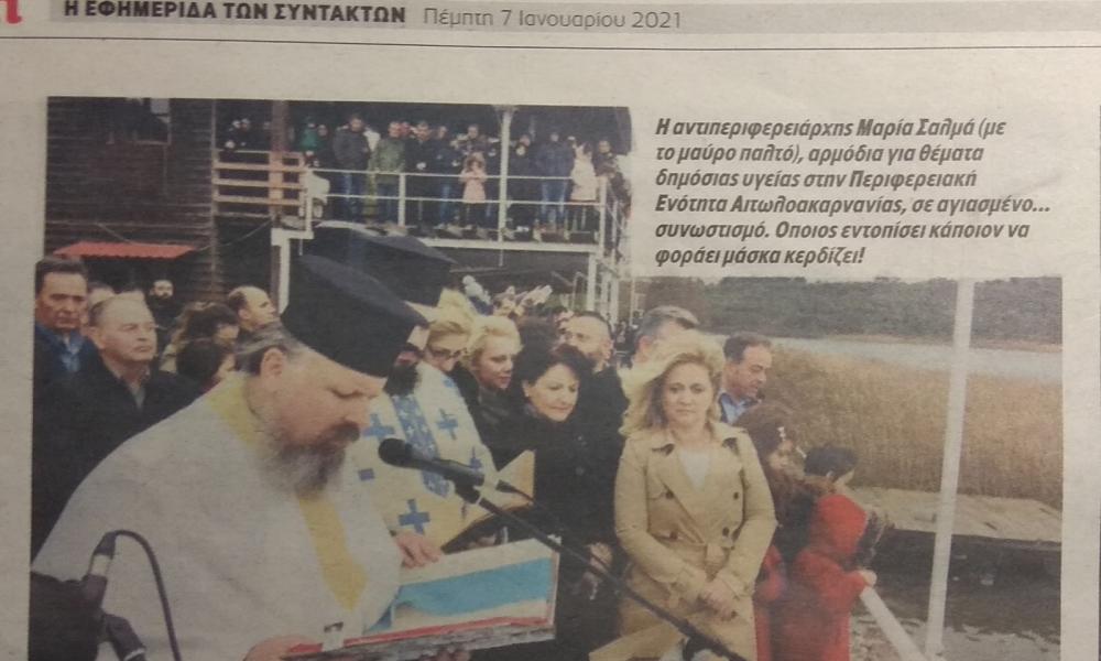 "Σε άρθρο που δημοσιεύθηκε στην Εφημερίδα των Συντακτών, την Πέμπτη 7 Ιανουαρίου 2021 με τίτλο: «Τους άλλαξαν τα… Φώτα» (σελίδα 12), παρατίθεται φωτογραφία από Τελετή Καταδύσεως Τιμίου Σταυρού στον ποταμό Αχελώο και ιδιαίτερα στην τεχνητή λίμνη του Στράτου Αιτωλοακαρνανίας, η οποία (τελετή) δεν πραγματοποιήθηκε ποτέ κατά τη φετινή χρονιά.